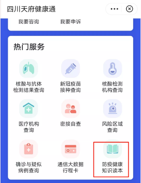 2.即日起,我们只要打开四川天府健康通,在首页下拉到热门服务,点击防疫健康知识读本即可阅读。
