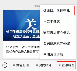 3.关注微信公众号“健康四川官微”,找到“健康科普”栏目,点击“健康四川 幸福有礼”即可阅读全书。