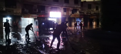 随着洪水消退,淤泥、杂物铺满每个角落。清理小组先帮助居民将店铺内部清扫干净,再将街道上厚重的淤泥一铲一铲地倒进河道,最后用水枪将地面冲洗干净。他们充分发扬“不怕脏、不怕累”的精神,经过连续三个多小时的战斗,时至清晨6时许,终于将该路段及周边店铺的淤泥清理干净,恢复了往日城市的美好面貌。