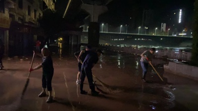 随着洪水消退,淤泥、杂物铺满每个角落。清理小组先帮助居民将店铺内部清扫干净,再将街道上厚重的淤泥一铲一铲地倒进河道,最后用水枪将地面冲洗干净。他们充分发扬“不怕脏、不怕累”的精神,经过连续三个多小时的战斗,时至清晨6时许,终于将该路段及周边店铺的淤泥清理干净,恢复了往日城市的美好面貌。
